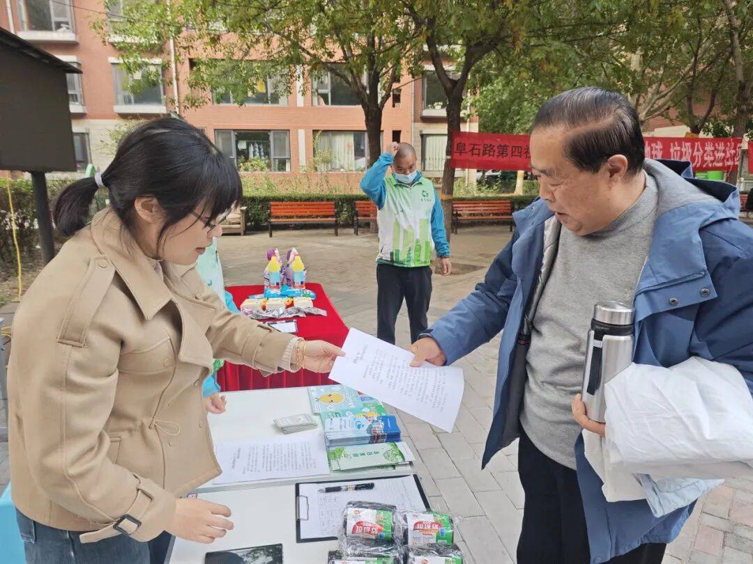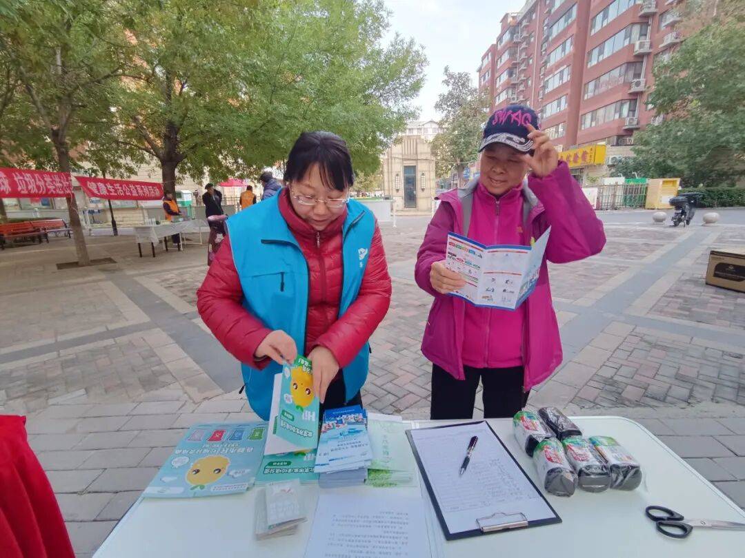 借此机会,知识宣传区的工作人员向居民们发放《居家安全》《人人讲安全,个个会应急》《首都市民垃圾分类指南》手册和《蓝朋友护您秋冬安“居”——消防安全温馨提示》宣传单,讲解消防安全案例,分享应急方法,强化居民安全意识;另一方面,围绕“为什么要垃圾分类”“如何进行垃圾分类”等问题详细讲解旧物回收利用的环保知识,引导大家树立“节约资源、绿色生活”的理念,培养居民的垃圾分类习惯。