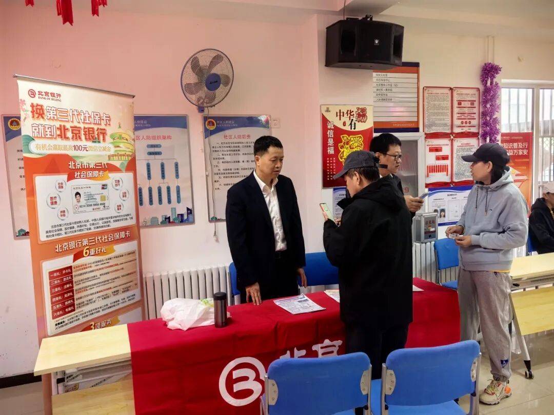 走进社区活动室,政务服务与咨询服务同步推进,为居民解决“急难愁盼”。社区联合北京银行、工商银行工作人员现场为居民办理第三代社保卡,从信息核对到卡片激活全程指导,实现业务“家门口”办结,极大便利了中老年居民。同时,“书记接待”“法律咨询”等服务台有序设置,社区党支部书记许宏面对面倾听居民诉求,零距离回应关切,畅通了民意表达渠道,进一步增强了居民对社区工作的信任。